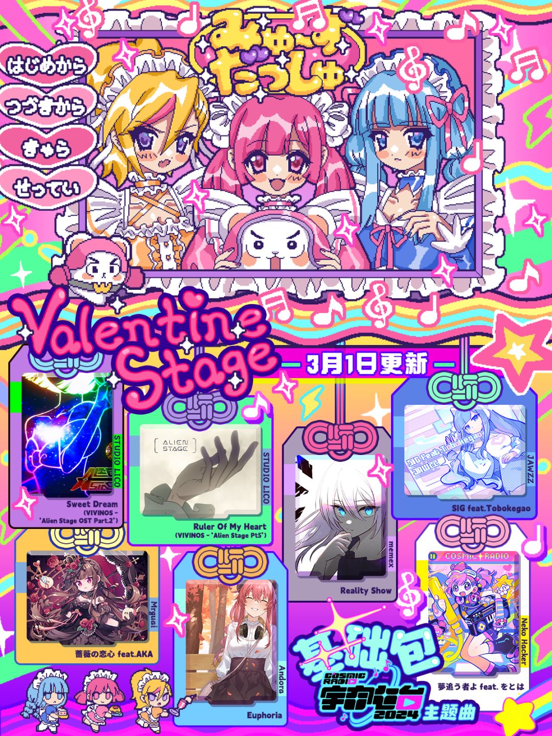 情人节主题包「Valentine Stage」收录两首异形舞台联动曲,还有宇宙电台 2024 主题曲「夢追う者よ feat. をとは - Neko Hacker」紧急!最速!加入基础包,兄弟,你先别来了_(-ω-`)⌒)_