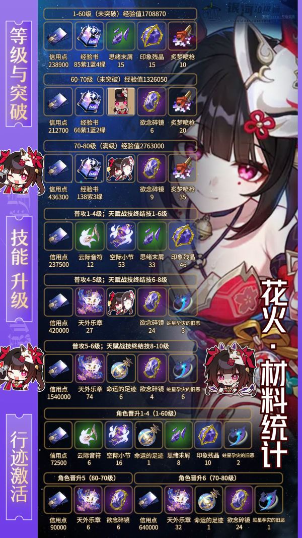 注意:花火的材料全都是2.0新材料!不要刷错了哦!如果主线剧情还未开启匹诺康尼地图,可以等花火UP期间限时开启的关卡刷取材料,限时结束后就必须开地图才能刷了。