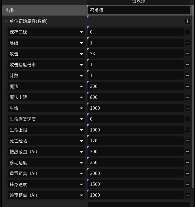 在常量配置中,新建了两个单位属性,保存三球和计数,计数用来记录新召唤的球的需要跟随的空单位的顺序,保存三球记录卡尔召唤的球的种类和数量。