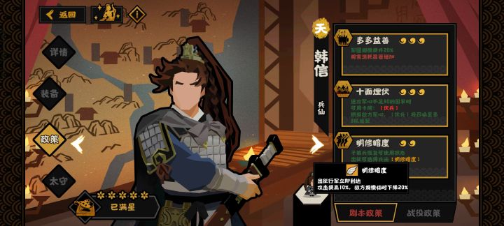 做为军事名臣,一般都应有前期破开局面的能力,比如吴起简单粗暴地加大量的战斗力,或是张飞这样武将强度高。韩信的目前痛点在于,三个技能两个能开局点出来的破不了局面,需要特资的明修暗度本身应当成为核心技能,却因削弱难以启动,成为半个添头了。