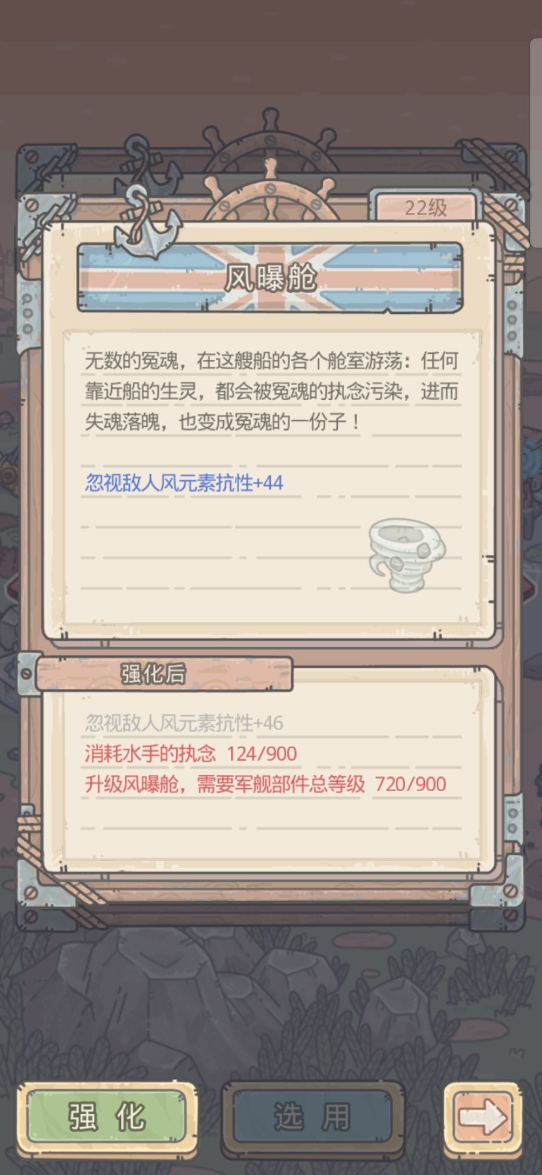 幽灵船特性想强化是有船部件强化等级门槛的,所以不能船全拆了点特性,但是也不需要船全部升满,因为船主炮升级需要铜币最多,且每级递增,所以需要让主炮等级尽可能的少点。