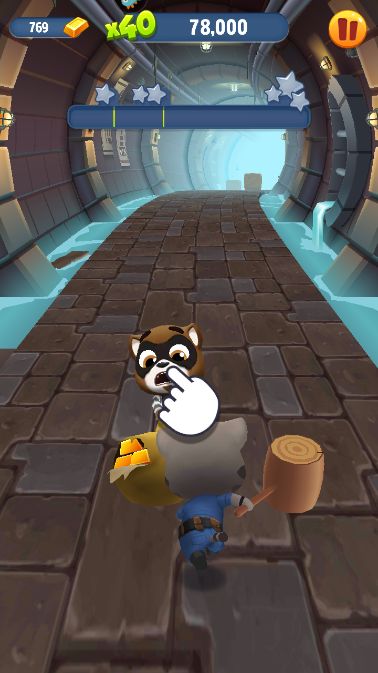奔跑速度拉满,完全没有失误,在游戏中还是可以抓住小偷的!我们的警官汤姆猫拿着锤子不断敲击惩罚小偷浣熊。当我们抓到小偷后,需要不断点击浣熊进行攻击,同事还会掉落大量金币。当攻击进程达到三颗星星后还会有额外的惊喜哦!