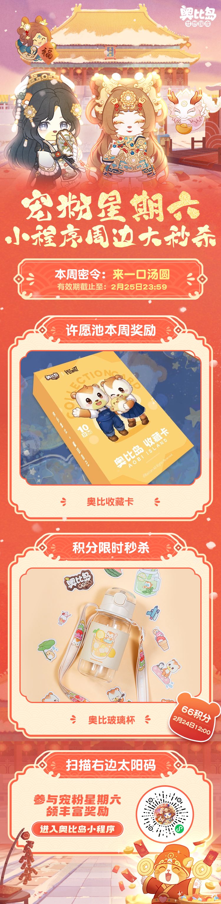 🧨小奥比们吃汤圆了吗?明天就元宵节啦,祝愿小奥比们像汤圆一样圆圆满满~奥比岛「上元灯火」活动开启中,「宠粉星期六」第四弹来袭~本周六奥比岛福利站小程序将上架许愿池活动,以及超低积分即可get精美周边,还有积分兑换密令,小奥比们记得在有效期内前往兑换~