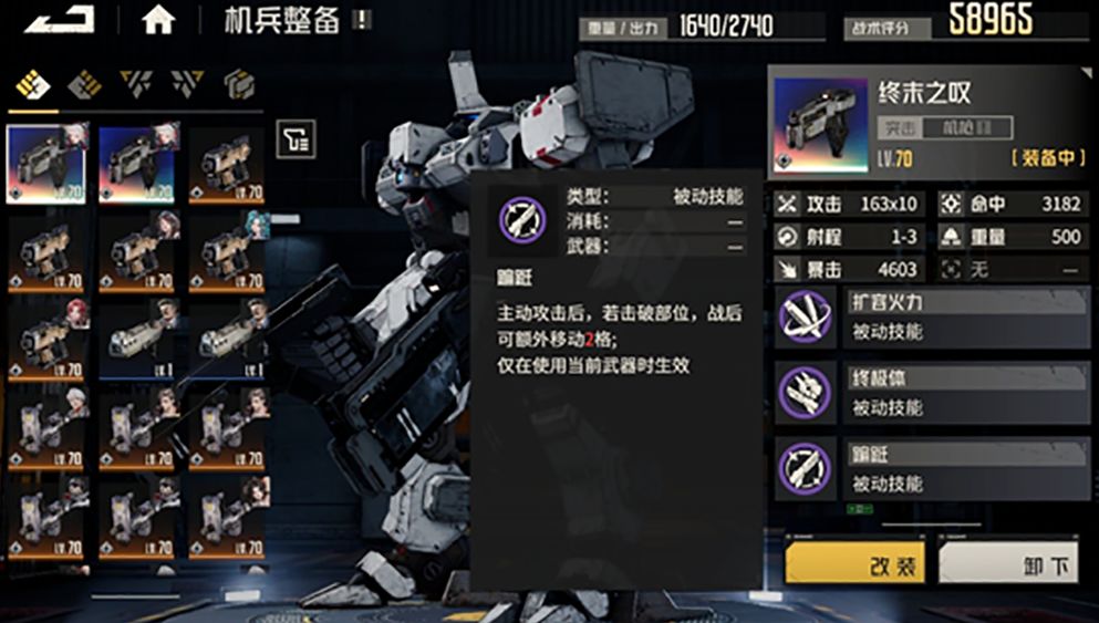接着从官方的图片来看,第一个机枪SS武器就是洛莎的专武,毕竟左上角就是洛莎的头像,而且装配的机兵也是XR,而从已经能看到的一个被动技能【翩跹】的效果来看,“主动击破对方部位后可以额外移动2格”,这点可以部分弥补洛莎身为突击角色有部分腿短的问题,在激活高算力上限的γ区后,不仅无攻击时可以额外移动2格,在主动攻击后也有机会额外移动2格。
