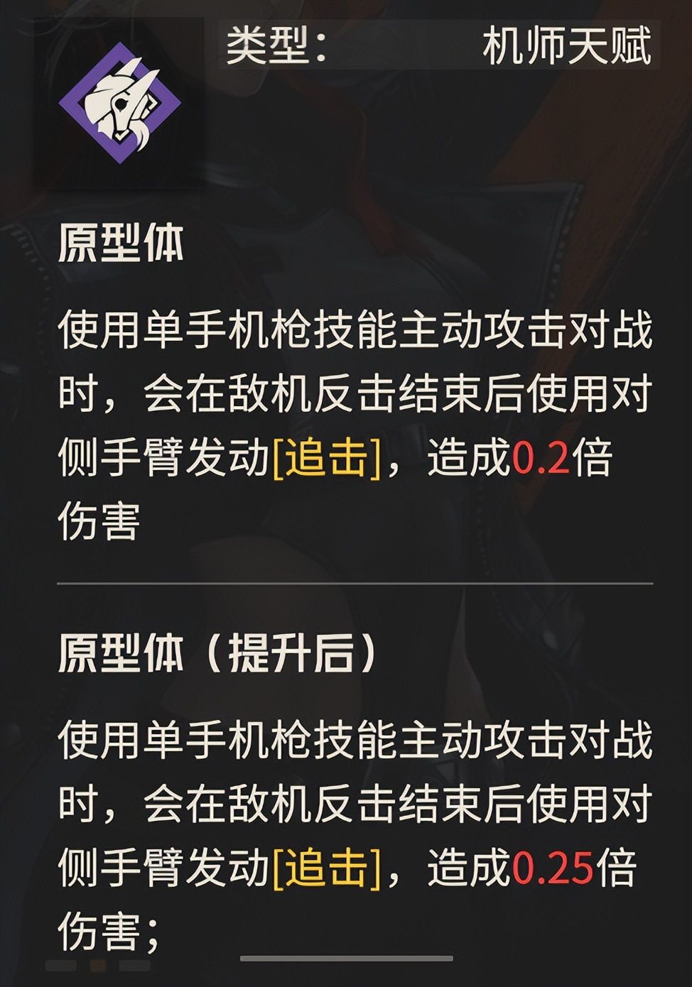- 【终极体】:这个技能无疑是针对洛莎天赋“原型体”的一个对应,所以其效果也很有可能是针对洛莎天赋的一个延伸,那么既然原型体是针对单手机枪的效果辅助,那么“终极体”很有可能就是针对双手机枪攻击的效果辅助了