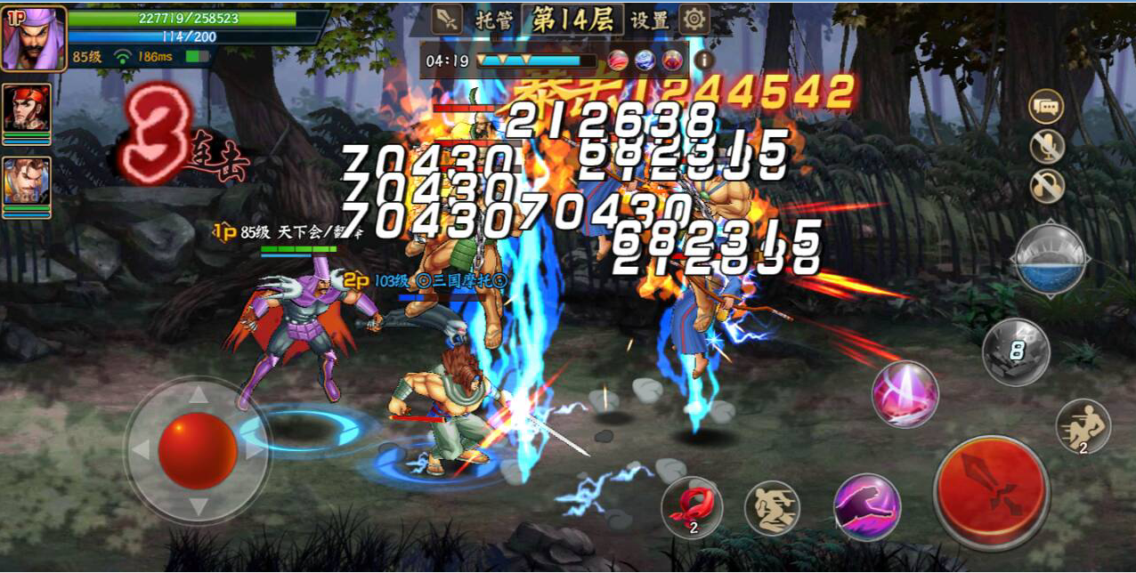 进入第三关你会发现此关地图开阔很多,并且在右上角有个木桶,桶中有相应的补血补气的道具物品;这里建议在大家失血不多的情况下保留用于不时之需,当然如果需要补血补气一定要留给战力高的毕竟应对黄月英还需大神当前锋(绿叶衬红花),面对黄月英时一定要采取分而击之的战术:高战力队友应对黄月英,而战力低的一方一定主攻弓箭手。因为黄月英自带三名弓箭手除了防高血厚之外还可以释放连珠快箭,分而击之一方面是分担了队友压力另一方面免除了后顾之忧。黄月英主要的攻击手段便是第一技能斗转星移、木牛流马和雷霆万钧。斗转星移有吸附功能保持好上下二格安全距离即可,而木牛流马则为全屏纵向攻击,这样一来你就会发现为什么战场较前两关宽阔了许多,此项技能虽为全屏纵向攻击但只要在木马滚动的间距中即可躲藏。需要强调的是:需要提防必杀技雷霆一击,此项技能类似于万花筒般四散攻击,范围大力度强一旦被击中就会陷入被连击的境地,唯一的躲避就是趁着必杀没有散开时候躲到角落里,所以还是那句老话:最好的防守就是进攻,把握好时机予以连击巧妙与之周旋,一旦没了有箭兵相助的后顾之忧黄月英便可束手就擒。