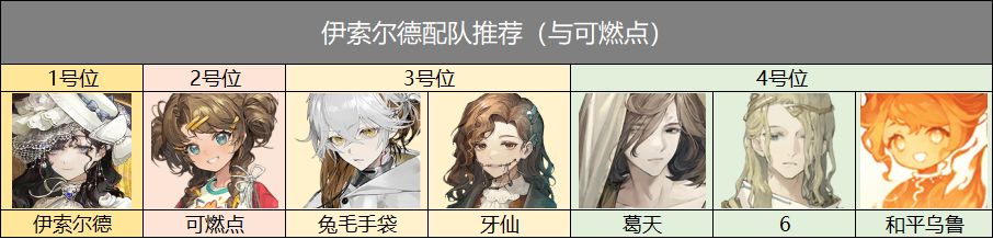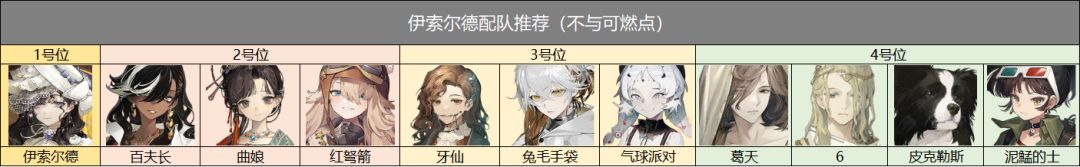 伊索尔德主要定位为进阶型削弱辅助,增益往暴击创伤和现实防御挂钩,也就是说,在脱离燃烧体系下,能适配的角色前提是现实创伤型角色,暴击率高的角色会比暴击率低的角色更合适,那么配队由此产生。燃烧体系下推荐可燃点+伊索尔德+牙仙或兔毛(0-1塑可燃点建议携带牙仙,能够保证暴击率,2塑及以上可以携带兔毛,单体核爆会比牙仙更强)+葛天/6/和平乌鲁(1塑葛天会更好,如果是0塑葛天,可以上6,减缓牌权压力);脱离燃烧体系下推荐百夫长+伊索尔德+牙仙+葛天(百夫长可以吃满夜色,同时百夫长暴击率足够高,对牌权要求不是很多,适配于伊索尔德和葛天),像是曲娘,红弩箭也可以与伊索尔德搭配,再携带牙仙和6/葛天,或者与未锈铠搭配(最好共鸣走暴击)打灵系克制也不错