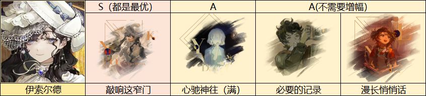 心相推荐优先选择伊索尔德的专武——敲响这窄门,其次选择满增幅的心驰神往,1增幅可以选择必要的记录,还可以选择高白值的术法心相漫长悄悄话,本身状态增益较多,大部分回合可以触发8%的伤害提升。