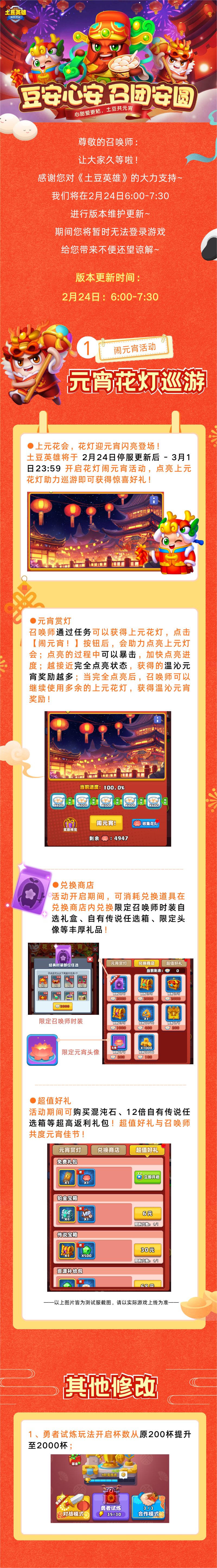 龙腾虎跃迎元宵,金龙献瑞送吉祥!又是一年元宵佳节,土豆英雄在此感谢你一直以来的陪伴与支持~提前祝您元宵佳节,阖家欢乐,幸福安康,事事顺心!我们将于2月24日6:00 期间进行停服更新,届时您将无法进入游戏,请您合理安排游戏时间,避免不必要的损失~