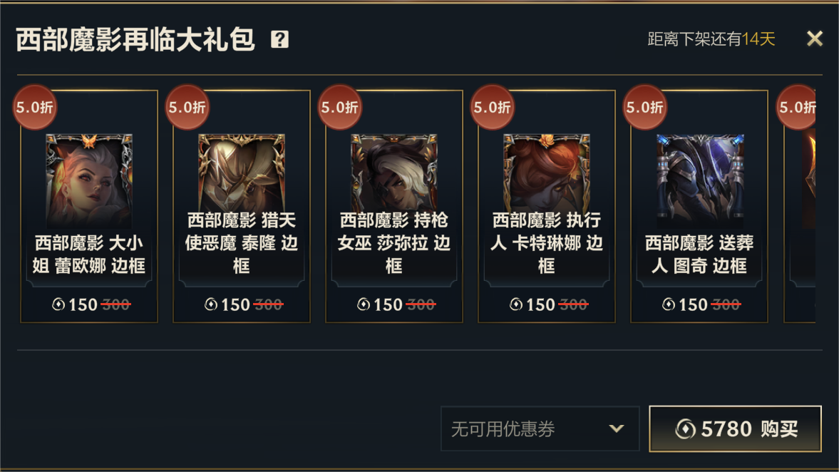 今日起,截止至3月7日23:59,西部魔影再临大礼包限时上架,五款皮肤均享8折优惠,还有皮肤姿态、皮肤边框、表情等道具也都享钜惠,总优惠价5780点券。