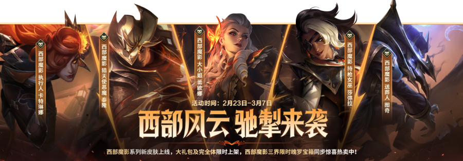 西部风云,驰掣来袭!西部魔影系列全新皮肤已正式上线峡谷!今日起,截止至3月7日23:59,西部魔影再临大礼包、完全体礼包限时上架,还有西部魔影三界限时魄罗宝箱同步惊喜热卖中~