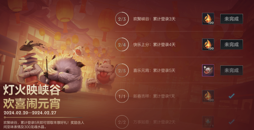 元宵节前夕,小魄罗们正在密锣紧鼓地准备灯火晚会,它们还为召唤师带来了元宵好礼!截止至2月27日,召唤师只需累计登录5天,即可免费获得龙魂水晶*300、3胜双倍晶石卡*1、表情“人间至味”奖励~召唤师们的元宵至味是饺子还是汤圆呢?