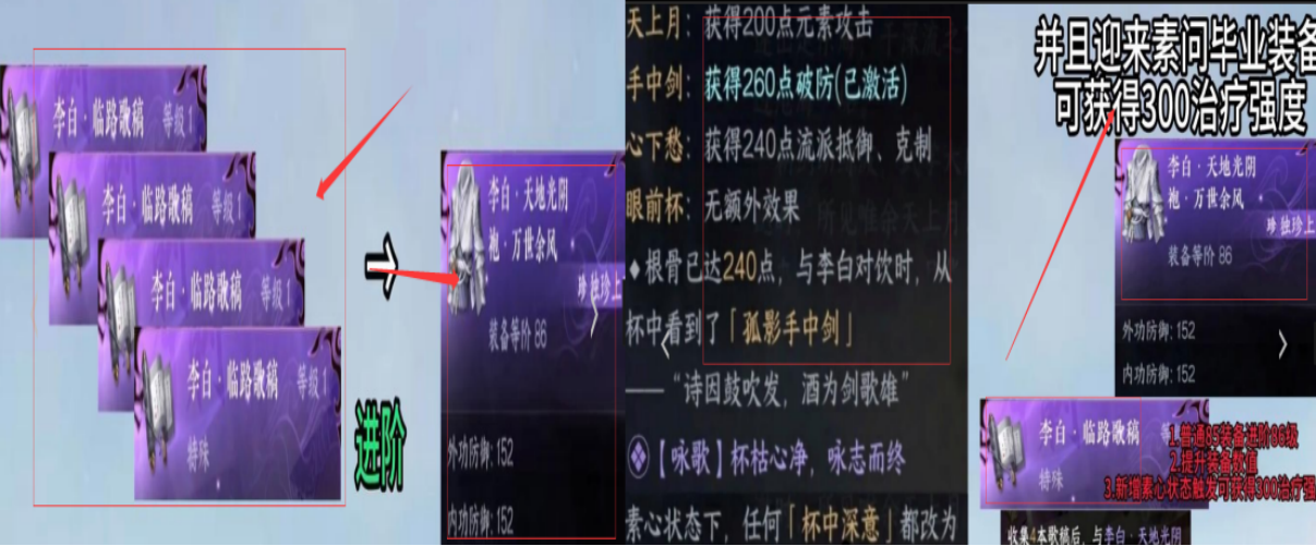 我们首先通关英雄副本可获得李白临路歌稿,首先用于进阶4次李白装备85.86奖励领取,我们并且迎来素问毕业装备可获得300治疗强度。就可以取得奖励领取方法,