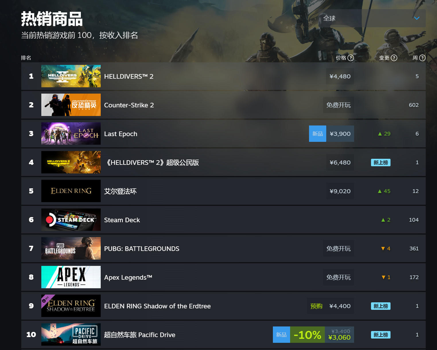 如上图,《艾尔登法环》目前是Steam(全球)第五大畅销游戏,仅次于《绝地潜兵2》和《最后纪元》。与此同时,资料片“黄金树之影”也榜上有名,位列第九。