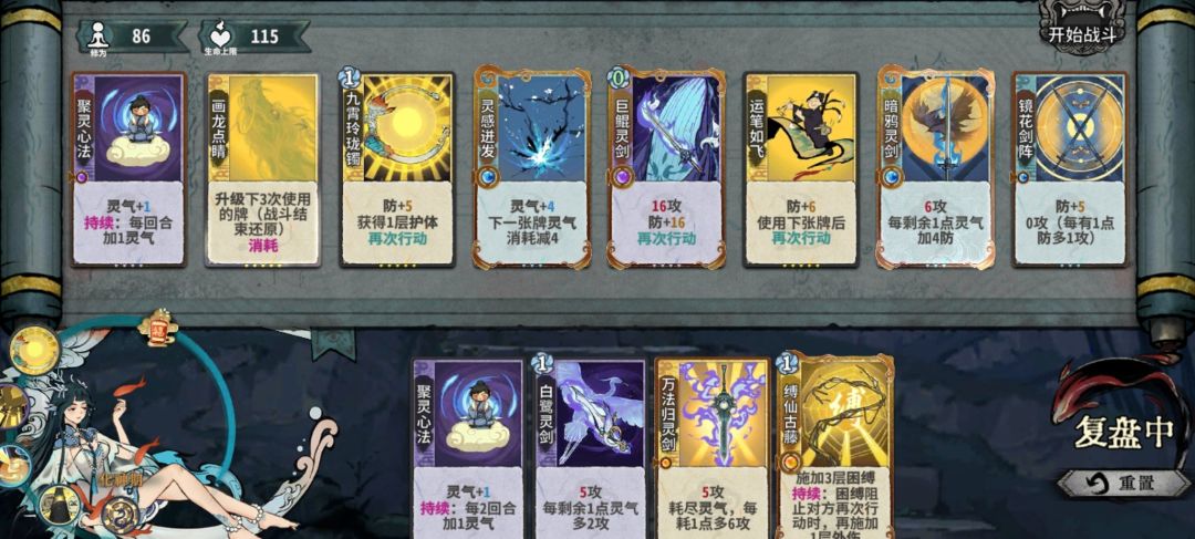 最晚12轮上化神。画龙和运笔是关键。当然每轮如果有牌d的话都要d空次数。如果前期抢了修为,基本上都能先手的话可以再组一套白鹭灵剑和万法归灵,遇到没防没护体的直接斩杀。当然,水月镜花配合御空连环等牌转剑阵也不成问题。