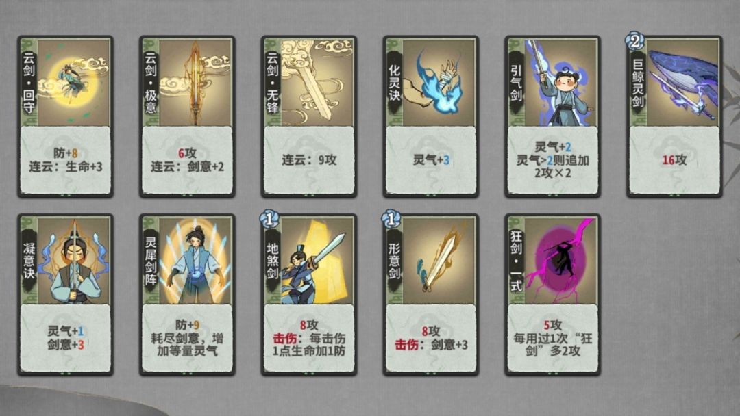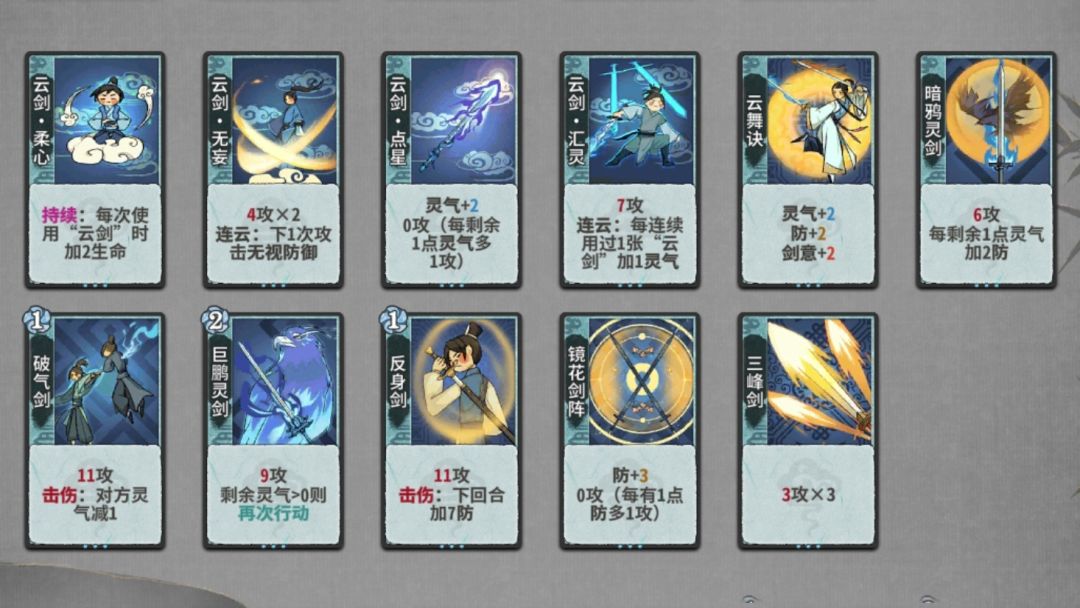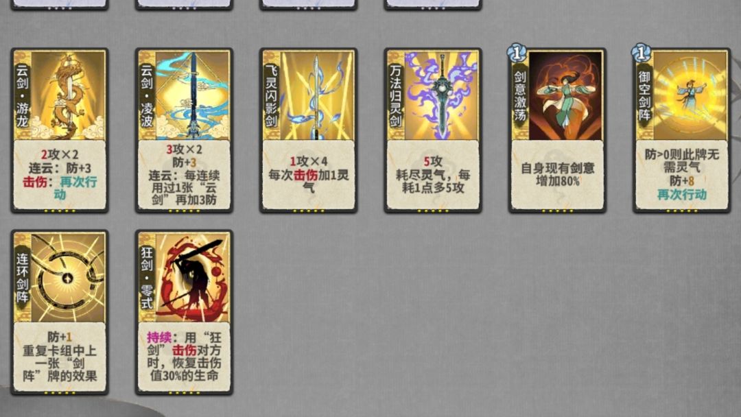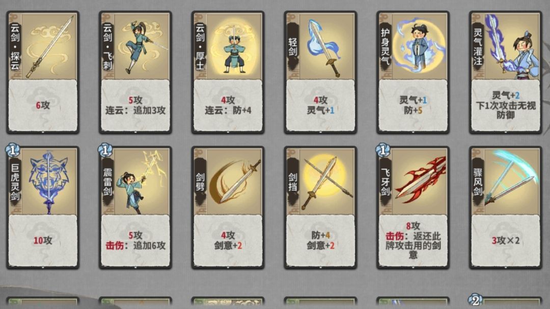 练气期来什么玩什么,探云飞刺和剑意飞牙震雷都有一定的强度。有灵气可以配合研墨和巨虎。我个人练气期一般不d牌,但质量太低可以少d牌。