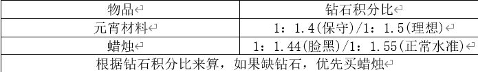 如果钻石储备不够,推荐优先买蜡烛,就算脸黑一点儿,也比材料的积分要高。正常水准,每100钻比买材料多15积分,材料买满总共消耗7.5k钻,如果拿来买蜡烛可以多出1.125k积分。
