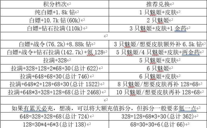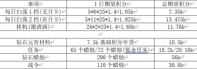 根据玩家不同的活动策略,下表给出的了各策略的积分总计,可以参考一下。先判断出自己的预期积分,再决定物品的兑换。