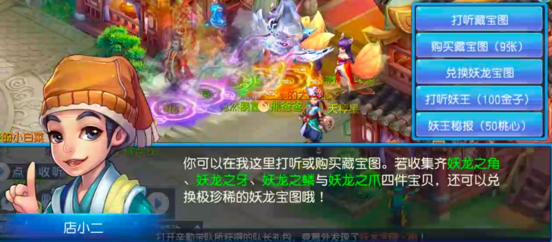 4.妖王挑战。妖王大概每6个小时刷新一次,需要到店小二处打听妖王下落,然后在预计时间内刷新,妖王战斗胜利后,保底获得一枚宝石,经常会获得高级兽诀,还有概率获得孩子神功秘籍,价值5万金币。