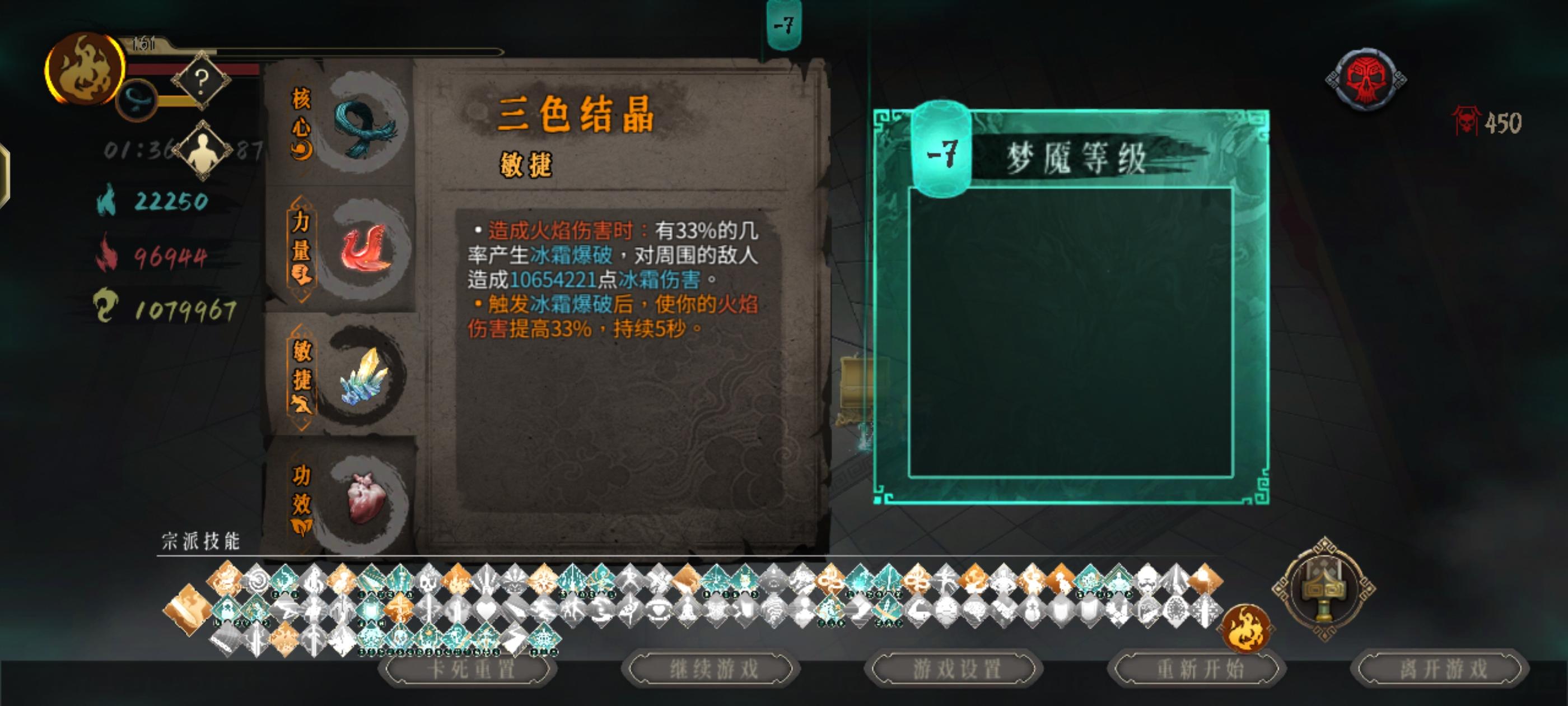 三号位带三色结晶,火焰伤害可以直接触发冰冻效果,梦魇技能可以选冰冻效果的那个,技能要选蛇酒,毒焰附带毒效果,梦魇技能再选择有毒效果加成的技能,每一次全攻击的提升都可以吃满三种属性的加成