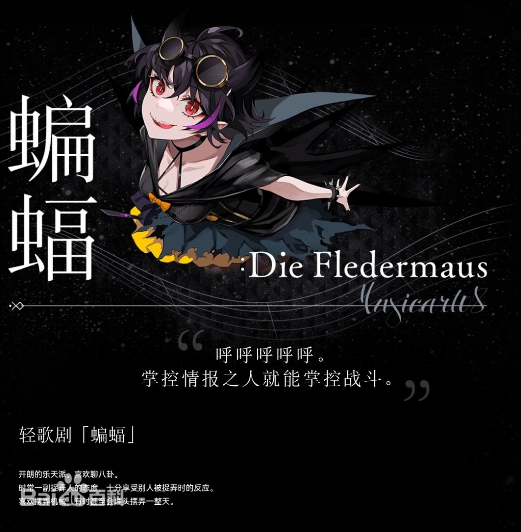 小歌剧的话,定义就相对更丰富了。有时候就泛指小型的歌剧,比如什么民谣歌剧,滑稽歌剧什么的,有时候干脆和音乐喜剧画等号。19世纪就专指规模小的歌剧,比如独幕剧。音乐则多采用圆舞曲(施特劳斯家族推幸福地应声倒地……)比如说我们的三幕轻歌剧《蝙蝠》,是小约翰·施特劳斯(也就是施特劳斯二世)作的曲。然后隔壁的《宿命回响·弦上的叹息》的蝙蝠姐姐,可酷了,给大家看看。当然我早就不玩了哈。