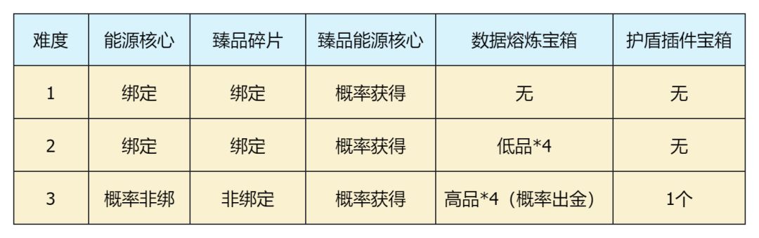 不同难度怪物拥有不同等级(数值有变动,机制不变),除最高难度可获取非绑定能源核心外,其他难度均绑定,其他奖励也有略微差别。(难度3与最早期的正常模式难度、奖励持平)