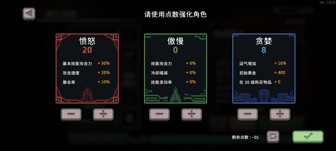 角色能力加点,真男人就是要极致的暴力输出,血只管扣就行,可以局内通过彩蛋叠回来,武器随意