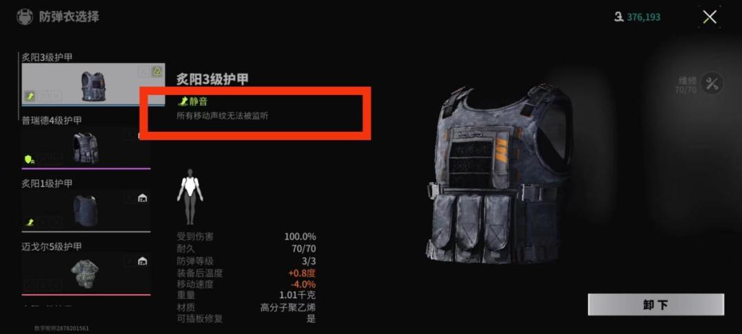 虽然跑刀流讲究白手起家,但没有一个护甲真的很容易“见光跪”,连人机都点不过。这里建议大家选择炙阳三级甲,炙阳系列的护甲可以消除移动中的声纹,也就是很多萤火虫所说的静音甲,其自带静音属性能让不会熟练使用静步的萌新更加安全。最重要的是其价格不贵,在对局中也经常能在人机身上搜到。