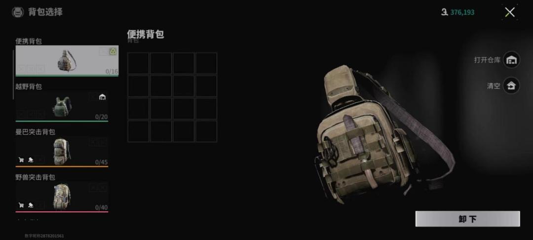 背包的话一般是越大越能带物资,但大背包通常较贵,萌新本身生存能力弱,丢了背包可能赚的还没亏得多。因此背包建议带最小的战术腰包或者20格子左右的便宜小背包。而且在对局中击败人机就能捡到更大容量的背包,所以大家也不必担心物资装不下。