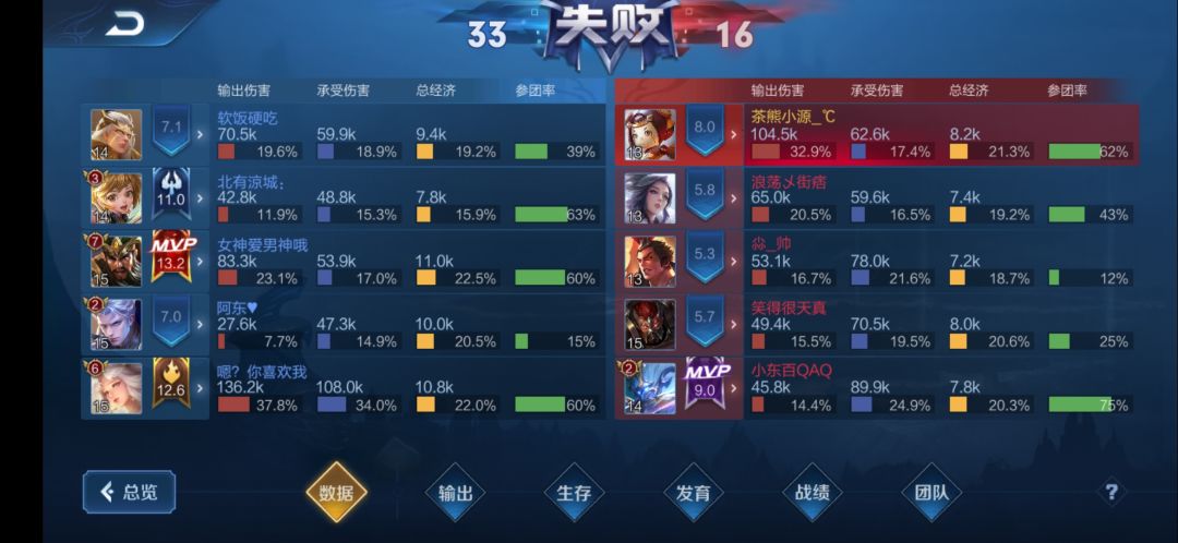 最后上图,看数据,嫦娥一个人伤害和承伤都是最高的,最后结束15分钟多一点,游戏内保存的那个录像也看不出来,就不发了,我手速反应都不行,看小地图和意识还是有的,全英雄技能还算了解,也就是几个赛季王者,反正输着输着有手就上去了,认为我瞎说不懂嫦娥技能出装机制这些我就不反驳了~