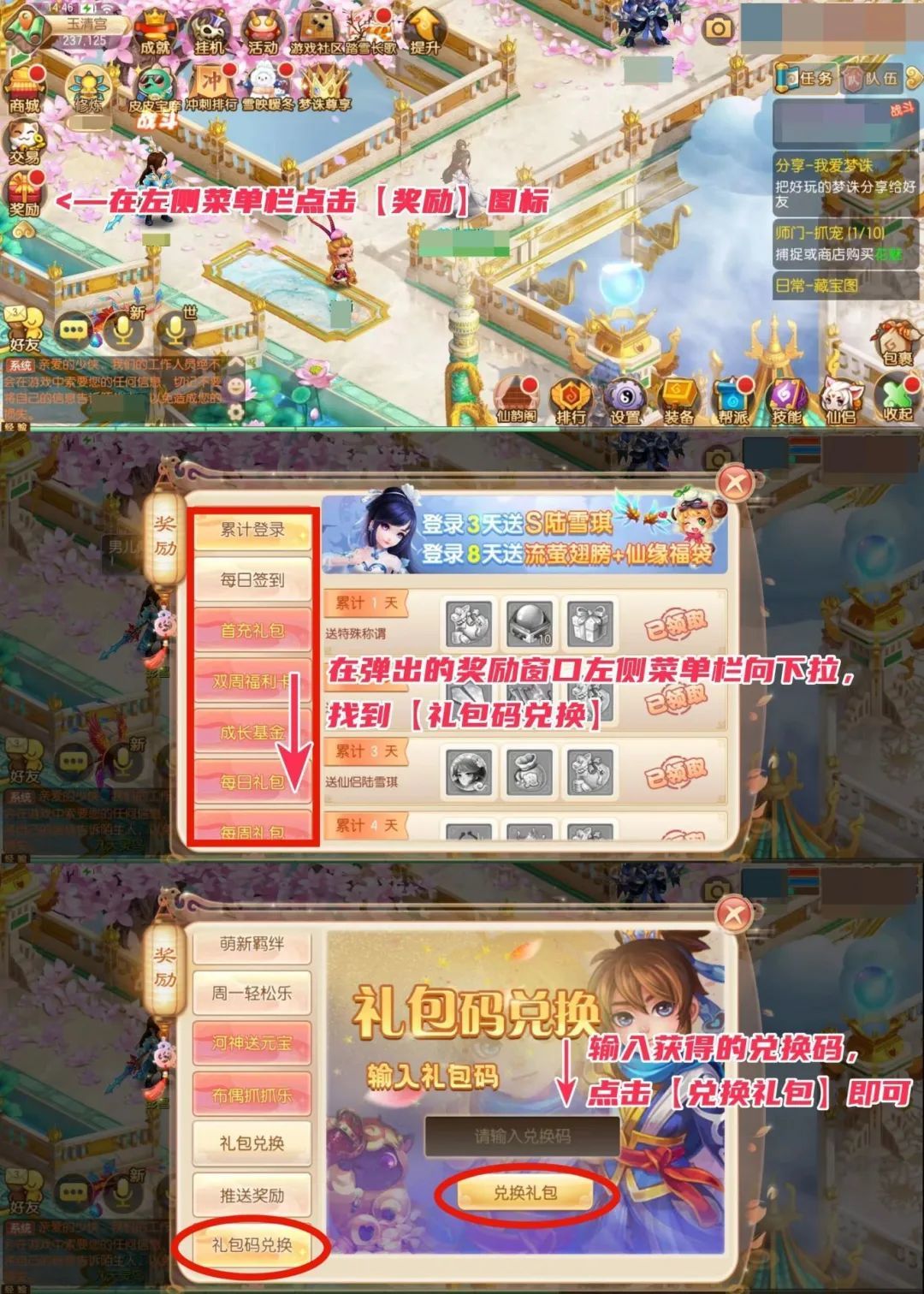 注意哦,红包口令码只在当日有效,请少侠们按照下图流程,尽快完成兑换!