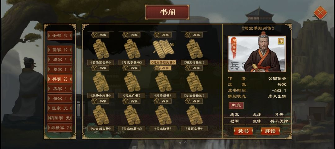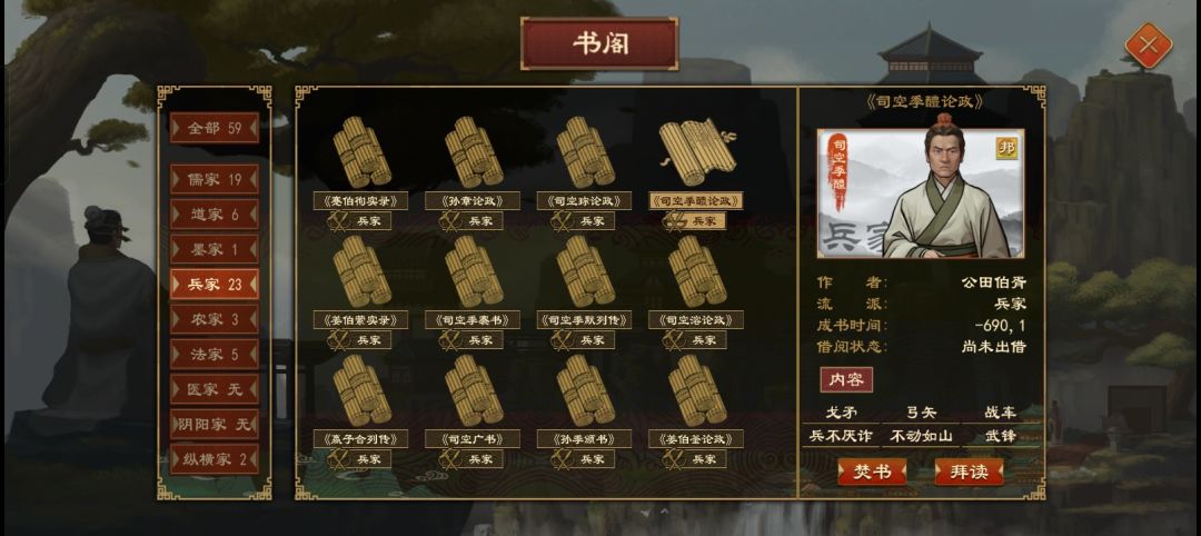 也可以依靠游戏遗传机制,做些细致的操作。例如孙武的子孙都有可能遗传到兵不厌诈,这时候让他的子孙去和有不动如山、迅疾如风这类技能的拥有者求学,然后学到了把流派转回兵家,再等其自然死亡留书,可以培养出兵不厌诈+特殊能力的杂合子,进而批量养成特殊能力将领。也可以利用每本书加五文化速度快速洗文化。