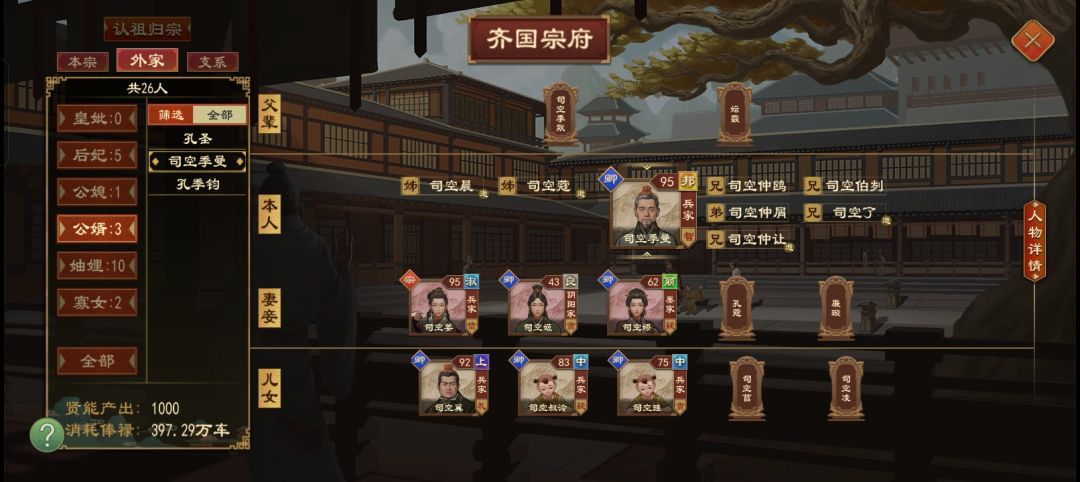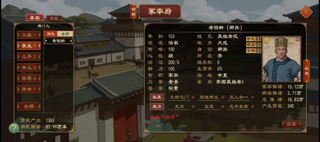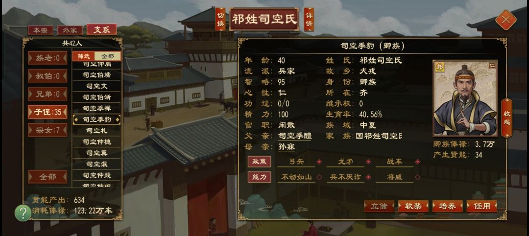 了解底层逻辑,就可以深度研究培养四世三公的方法了,在卿族生出儿子后,可以用公卿同时能吃到讲学和求学的机制,和宗亲讲学的高效性与宗亲求学吃不到讲学buff的矛盾,额外培养公卿。例如公卿讲2-3次,宗亲讲1次,保证公卿和宗亲都能适当吃到buff。另外还能利用公卿吃不到医家政策经常早死这一短板,让其自然留书。