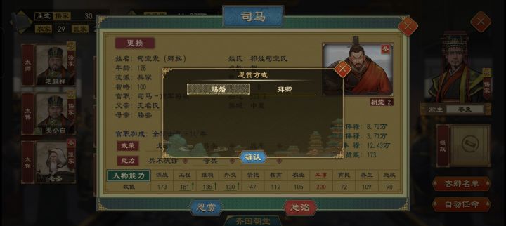 进入游戏第一件事,任命圣人为朝臣,然后赐给其宗女(后续有大用),接着过一年进入闾里,点开相应官职,看看其有没有儿子,有的话进入朝堂赏赐拜卿,没有的话可以花君威在其公府里面立家。