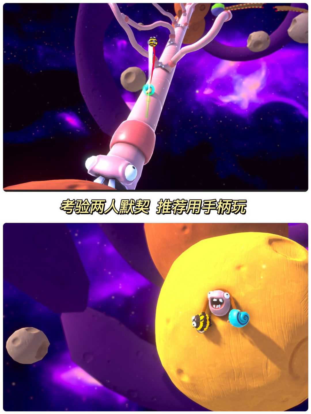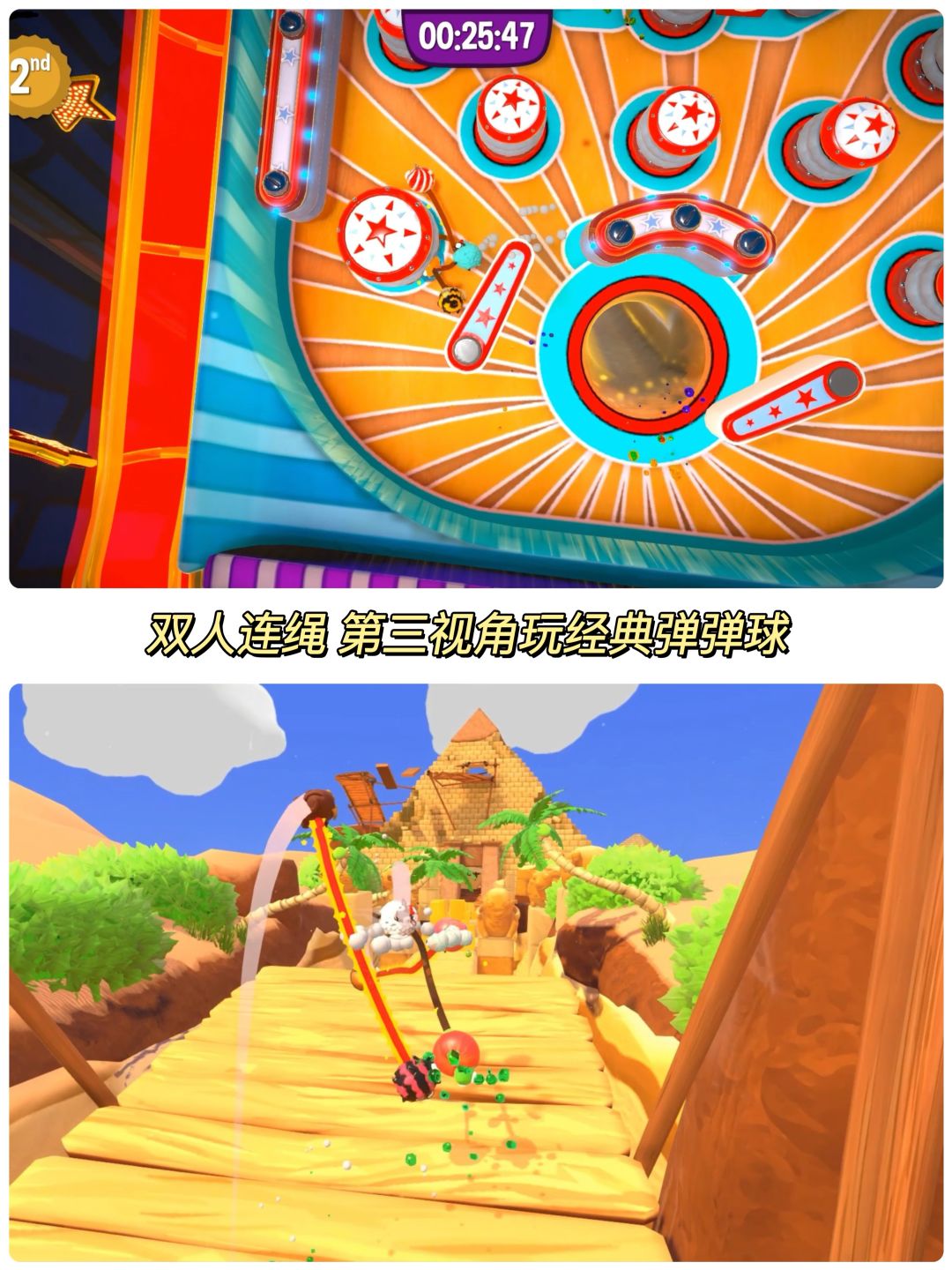 🌟 游戏中两名玩家分别系在可伸缩的弹力绳两端,组队跨过绚丽而混乱的障碍竞速场。
