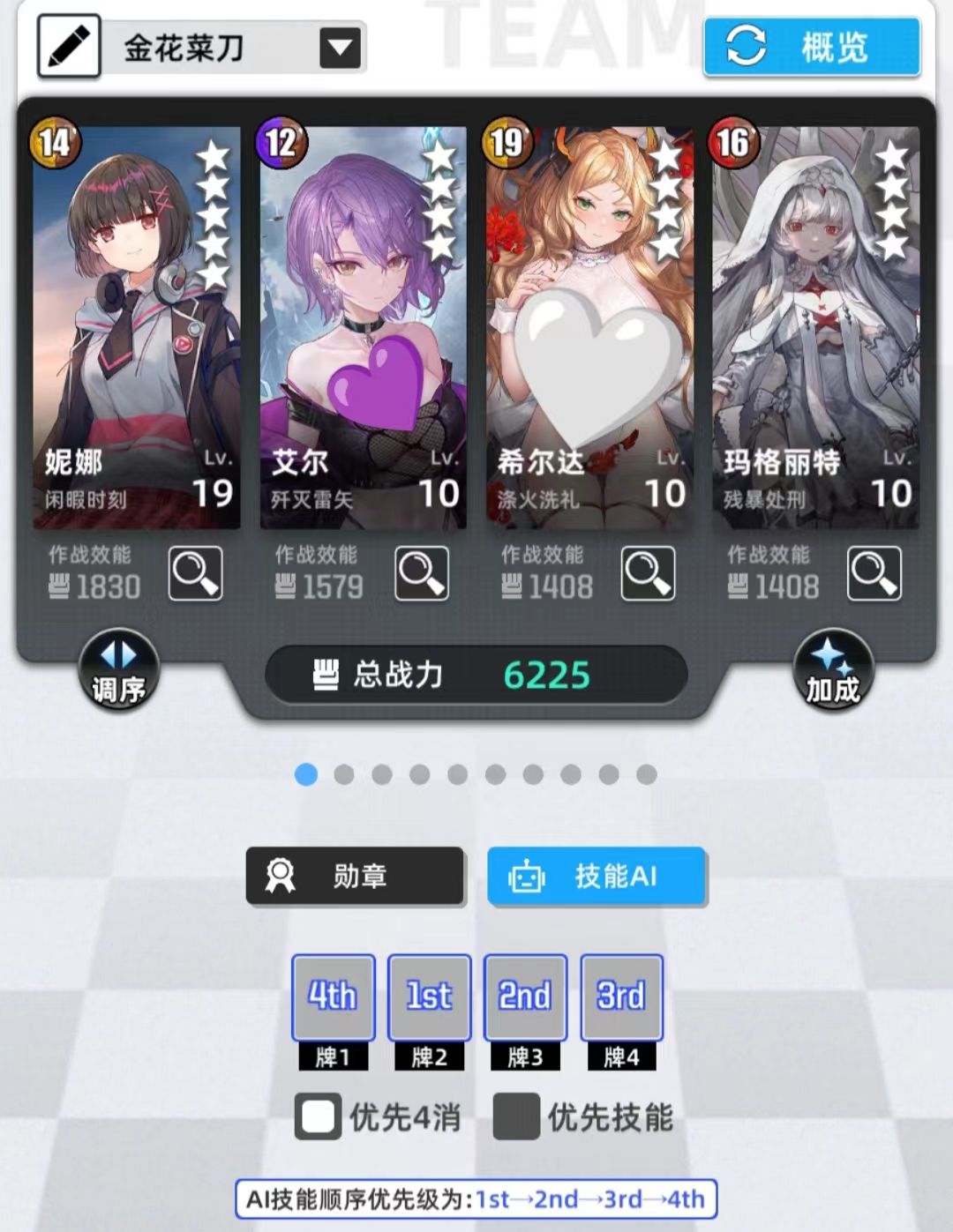 4动妮娜,技能本身效果较差,充能效果聊胜于无,但好在刀潮汐环境里有一定概率获得额外回合