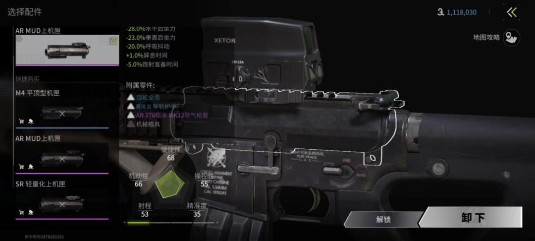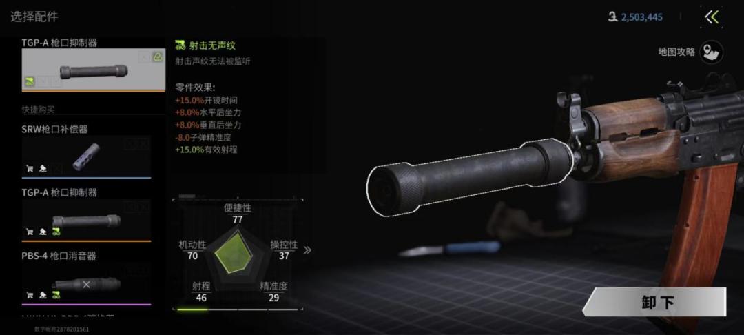 枪口主要是消音器,消焰器,补偿器和螺纹保护器,对于步枪和狙击枪一般选择消音器,方便在中远距离射击中掩盖声纹,对于冲锋枪这种贴脸突突的则没那个必要,一般选择螺纹保护器。一般来说,枪口的属性有降低后坐力,影响射程,增加开镜时间。对于步枪的改装思路以降低后坐力为核心,而狙击枪则以消音消焰的属性和增加射程为核心。