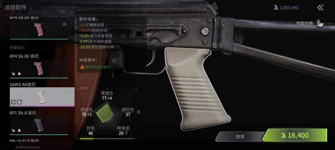 握把分为前握把和后握把,前握把是控制后坐力的关键,对于步枪而言有一个高级的垂直握把是非常关键的。后握把主要是对于开镜时间和体力消耗的影响,选择红色以上的就几乎没有debuff。