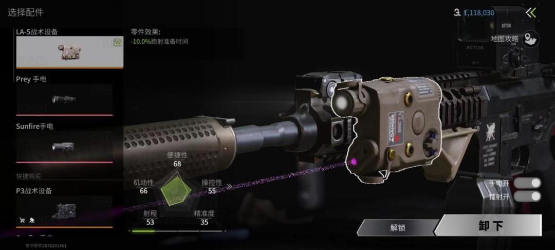 战术设备主要是手电和镭射,属性主要是跑动开枪速度和子弹精度。但手电实战作用不大反而会暴露自己位置,几乎用不到。如果枪的战术设备有镭射的话可以考虑加一个,对于步枪而言镭射能大大提升腰射准度。