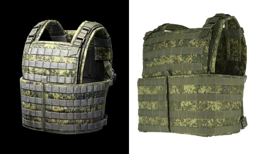 士官涂装暗区中这两款防卫者系列防弹衣在外观上几乎没有区别,仅仅涂装颜色不同,它们的原型均为由STICH PROFI生产的商业版俄罗斯Defender 2防弹衣,因此并没有被任何部队列装。相较于原版DF 2常见的纯色配色,商业版在视觉上最大的特点是使用了褐色&深绿的森林迷彩。而基本设计则与原版大差不差——同样配有可拆卸式护颈及护裆,并且还可以使用DF 2原装防弹插板及插板袋。