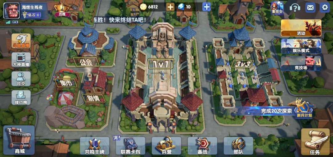 (看到屏幕上边那个钻石数了吗,贫穷玩家在线明示)我们就来依次介绍一下这些功能,右上角集结令是新手阶段英雄牌升级可以得一些资源,娱乐模式和竞技场是逐渐解锁的游戏内容,右下的任务拿资源,属于通行证一类的内容