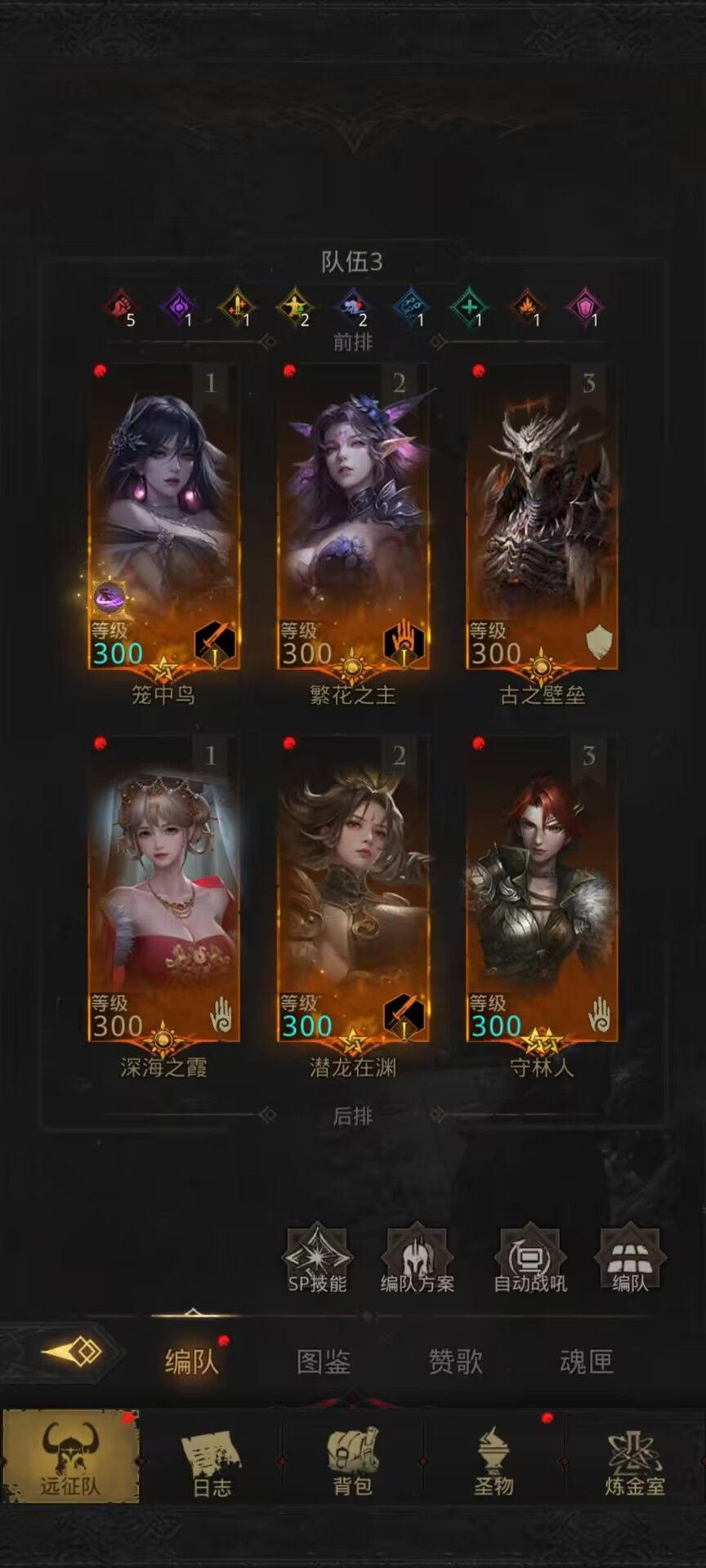 如果有SP燕子,并且有生灵之灾,可以替换成:夜莺拿二代武器,水母拿地狱信使,繁花拿曙色明光,守林人拿烈星,燕子拿生灵之灾,龙人拿绝风。在需要群体致盲时,水母就带厄运之拘(致盲书),如果没有的话龙人依然拿豆剑。