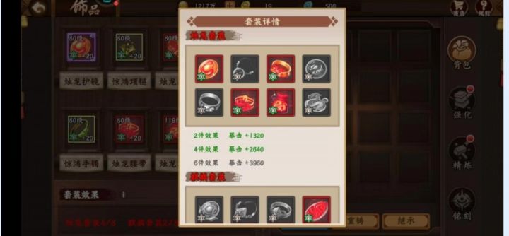 暴击篇 在三国战纪2中,提升暴击数值的方式主要有以下几种,各位主公可以进行参照。 饰品套装 常规的2烛龙+2麒麟+4惊鸿便可提供1320+1080+900+1800=5100 点的基础暴击。 如达到6烛龙+2麒麟更是可以实现1320+2640+3960+1080=9000 点的高额暴击。