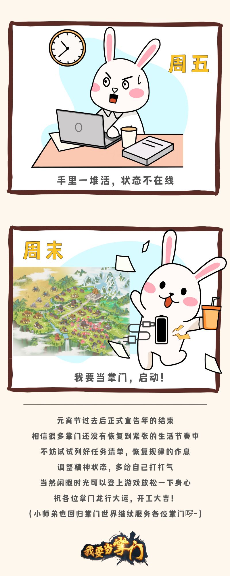 大师兄在马不停蹄的拓展掌门世界了,师妹也在整理新的活动福利,小师弟我也不能闲着,新的一年拿出100分的状态服务好各位掌门。