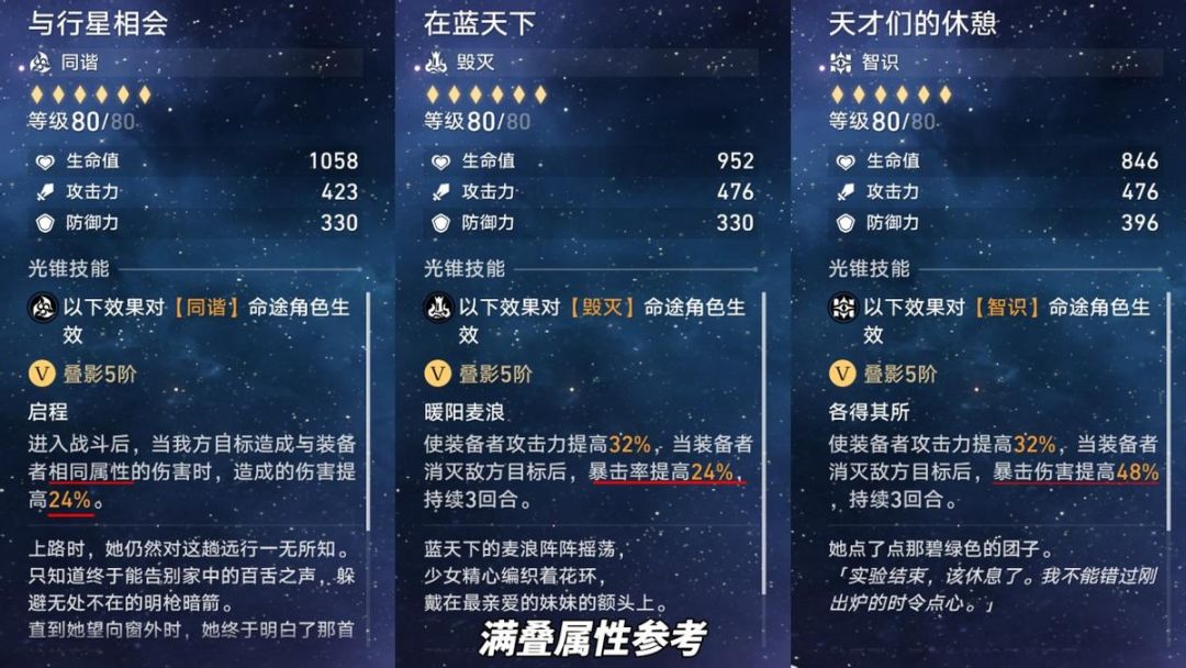 「与行星相会」同属性队伍中同谐光锥的强劲选手,时常会和各种5星比对,24%的无条件全覆盖增伤真心不错!「在蓝天下」非常慷慨的24%暴击率,仅需击杀触发难度不高,以及全程覆盖的32%攻击力。只要存在小怪、精英怪/首领怪会召唤小怪,此光锥都有非常不错的伤害期望。「天才们的休憩」击杀提升3回合48%暴击伤害,以及常驻32%攻击力,可以说利好智识角色的环境基本也利好此光锥!