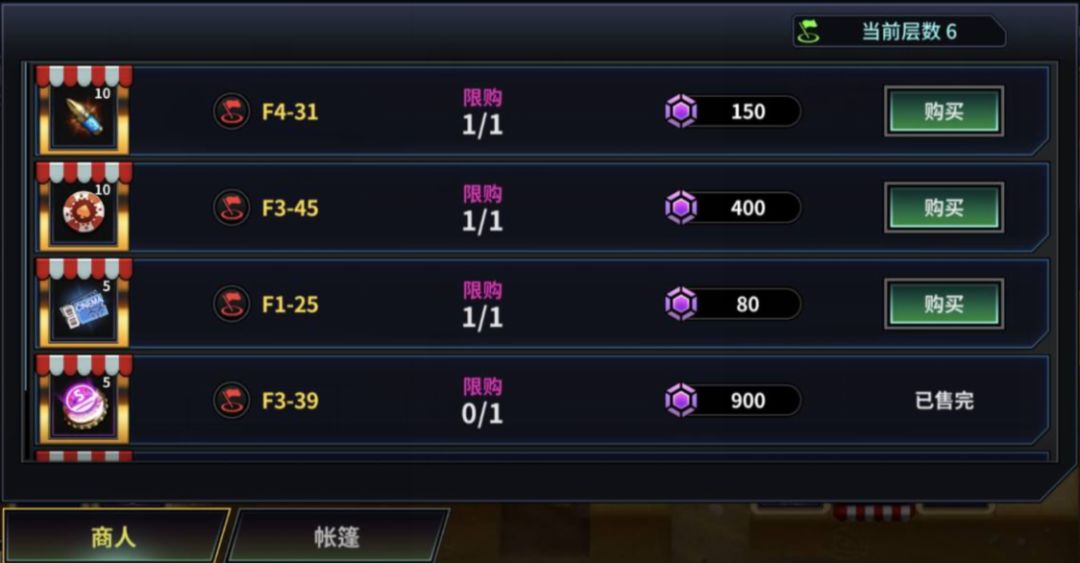 3.3.商人格子:踩到后可消耗货币购买对应道具,仅1次。(可不立刻购买,后续依旧可购买,在左下角历史格子查看)