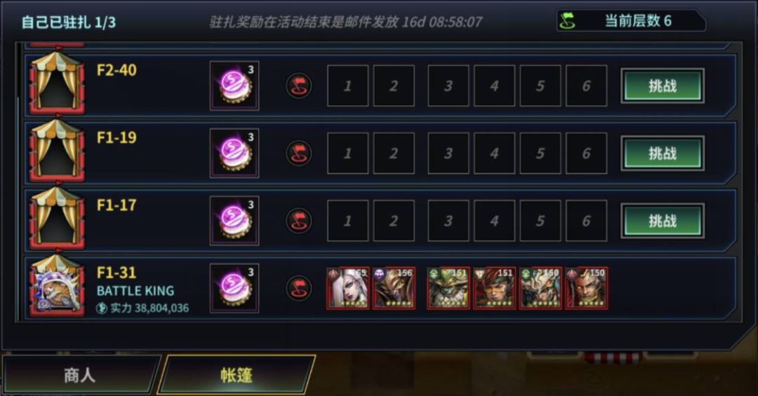 3.4.帐篷格子:踩到后可进行驻扎或者对驻扎者进行挑战,胜者驻扎,活动结束后可获得对应驻扎点的奖励,每个玩家仅可驻扎最多3个格子。(可不立刻驻扎/挑战,后续依旧可驻扎/挑战,在左下角历史格子查看)