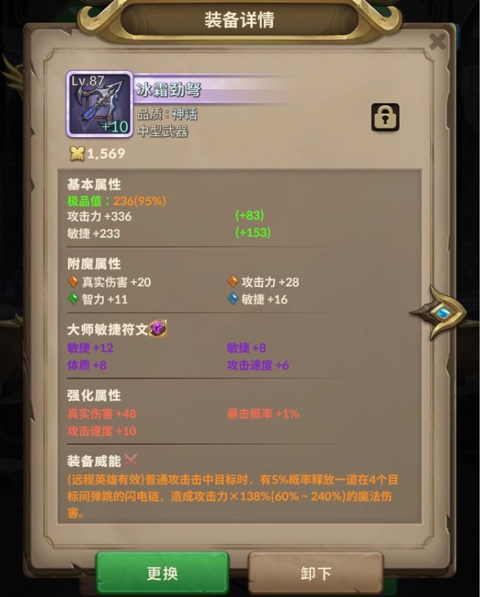 升级到神话后是有8%的暴击率 —— > 强化和附魔属性可以选到真实伤害+攻击速度。