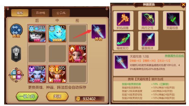 在上阵的时候可以根据同阵营的英雄来上阵,同阵营的英雄上阵的数量越多,激活的同阵营加成属性越多。当然,阵营之间有克制效果,如果在战斗前知道对手是什么阵营,可以选择克制对手的阵营的英雄,这样可以增加自己的胜算。另外在激活神兵后再布阵界面可以佩带神兵,神兵在战斗中可以提供不少的输出伤害,每一把神兵都有它独特的技能效果,小伙伴们可以根据不同的情况来带不同的神兵。