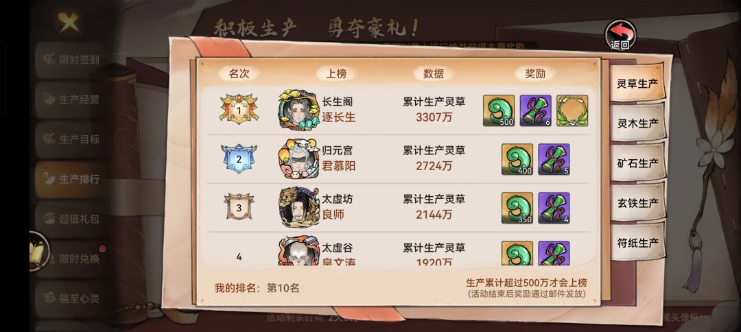 生产排行:前50有奖励,第1名头像框,最低100灵玉,